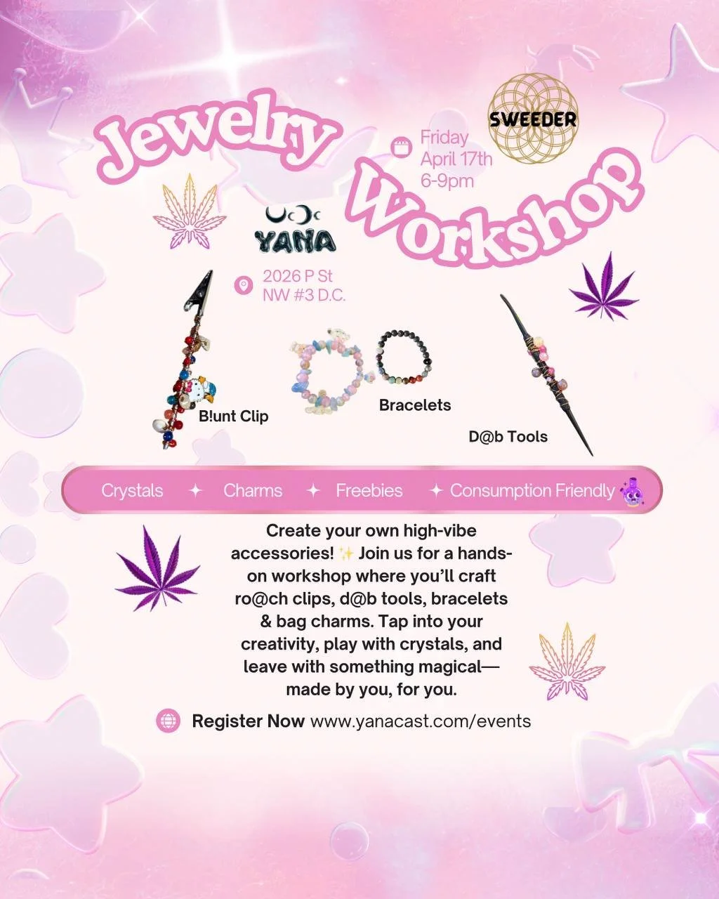 Looking for unique 420-friendly events in Washington, DC? Join us every Saturday during YANA’s Full Moon Fest for a high-vibe gemstone jewelry workshop—perfect for cannabis enthusiasts and creative spirits in the DMV area.