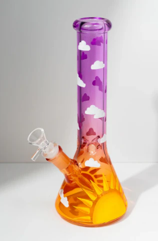 This bong features a gradient coral to purple finish finished with handpainted cloud & sun details Includes an ice catcher for smoother hits Made from durable borosilicate glass Includes downstem and 14mm male bowl 10” tall