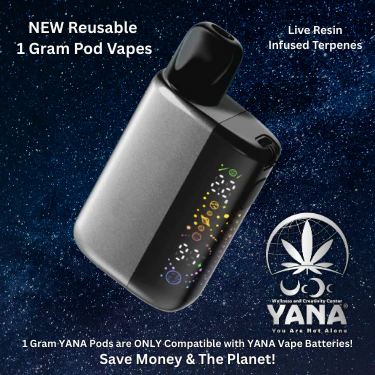 1 Gram YANA Reusable Vape is infused with Live Resin Terpenes. The YANA Pod System is a next-generation, reusable vape experience designed by the YANA team for elevated, everyday use. Each 1-gram pod magnetically clicks into the YANA reusable battery โ no twisting, no mess, just seamless connection that looks and feels like a sleek disposable. Infused with live resin terpenes for terpene-rich flavor and smoother effects, itโs a cleaner, more sustainable way to elevate your orbit. Your first purchase includes both the pod and battery for $60, and every refill pod cartridge after is just $50! โ saving you money, while reducing waste! NO compromise on quality.