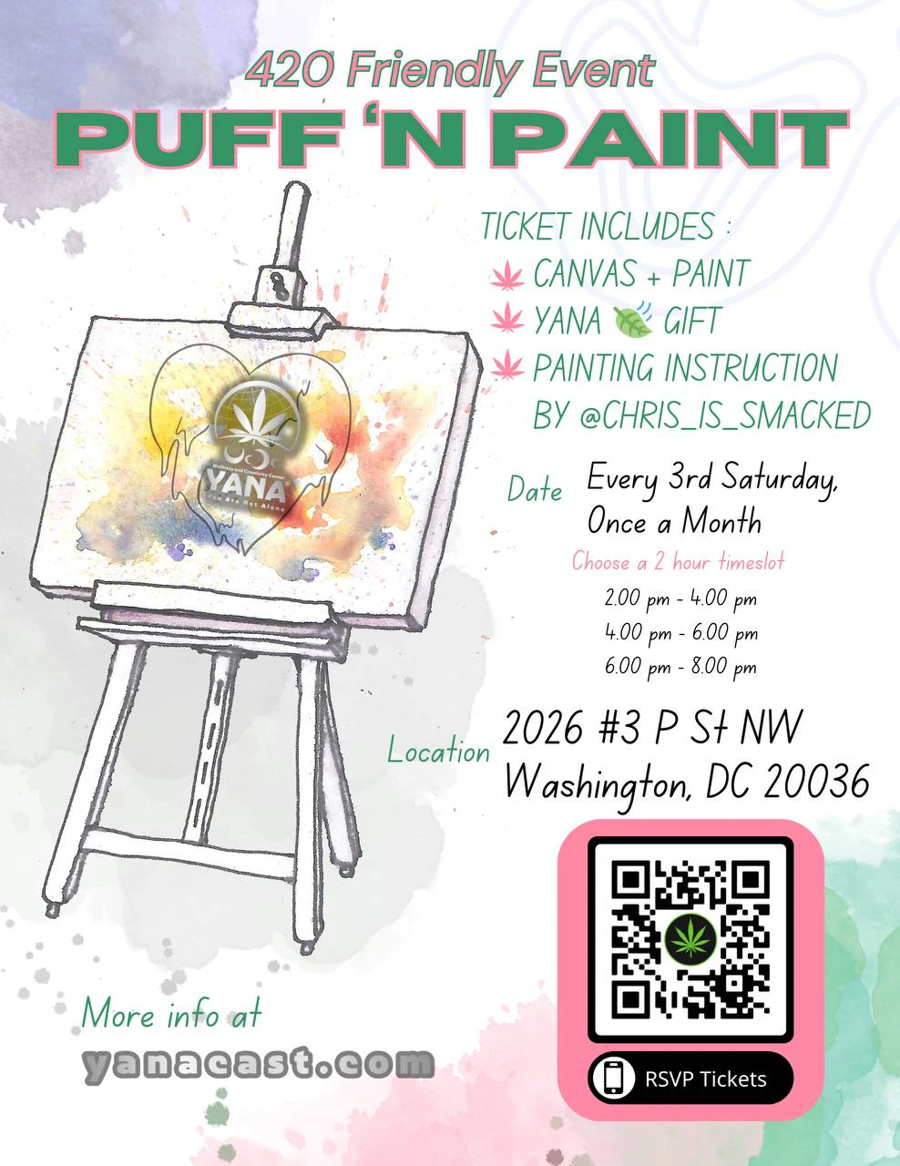 420 Friendly YANA DC Event Disclaimer: YANA is a Safe Use Treatment Facility. This permits the on-premises consumption of cannabis products purchased on-site at the retailer within designated areas. YANA provides Bubblers and Vaporizer devices during our onsite events! INCLUDED: 1 Infused 5mg THC Drink by Pink Fox included with ticket purchase. NO papers or pipes can be smoked inside. Flower CAN be purchased and smoked through a bong, bubbler, or vaporizer! This keeps our neighbors happy so we can continue providing 420-friendly community events.